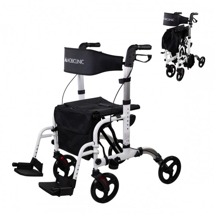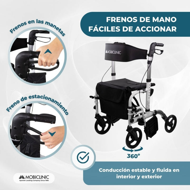 Andador con reposapiés y respaldo | Plegable | Aluminio | Frenos | Ruedas 360º | Bolsa | Porta bastón | Ibiza | Mobiclinic