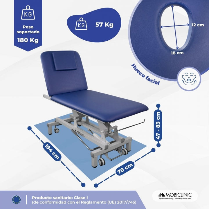 Su diseño incluye un agujero facial anatómico de 11 x 18 x 8,5 cm con cojín tapón que mejora la comodidad. Además, cuenta con detalles pensados para optimizar el trabajo diario como el porta rollo integrado para el papel de la camilla. Su capacidad de carga es de hasta 180 kg y está indicada para usuarios de más de 146 cm de altura, ofreciendo seguridad.
