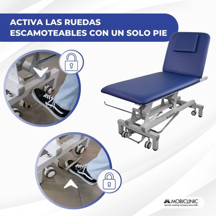 Para facilitar el movimiento y la estabilidad en consulta, cuenta con ruedas escamoteables de 7,62cm que se activan mediante pedal. Con este sistema, la camilla se eleva sobre ruedas para desplazarse cómodamente y vuelve a fijarse en una posición seguro al desactivar el mismo. Además, dispone de niveladores en cada pata para asegurar estabilidad en la camilla incluso en suelos irregulares.