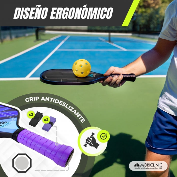 El set de Pickleball Mobiall es una opción perfecta tanto para jugadores principiantes como para exportes que buscan una actividad física completa y divertida. Incluye 4 raquetas fabricadas con fibra de vidrio y núcleo interior de panal de polímero, material que ofrece combinación de control y potencia durante el juego. Sus empuñaduras ergonómicas con grip antideslizante y absorbente aseguran una sujeción cómoda.