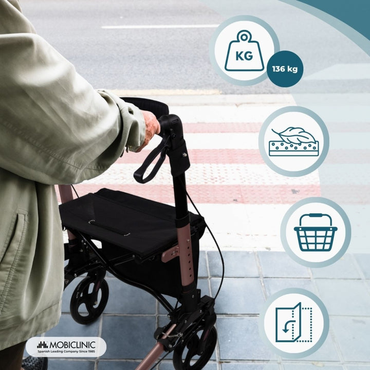 Andador plegable | Aluminio | Hasta 136 Kg | Frenos en manetas | Asiento y respaldo | Oro Rosa | Trajano | Deluxe | Mobiclinic