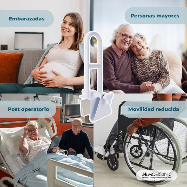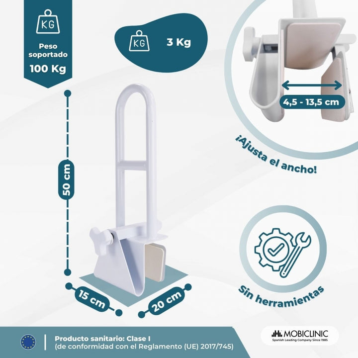 Se ajusta a bañeras con bordes lisos y planos, con un ancho mínimo de 4,5 cm y un máximo de 13,5 cm, adaptándose así a diferentes modelos de bañera. Además, su manija ergonómica permite un agarre firme y seguro, incluso con manos húmedas. Destaca principalmente por su diseño robusto, capaz de soportar hasta 100 kg y es perfecto tanto para uso clínico como doméstico.