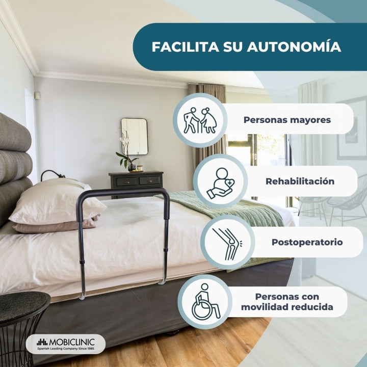 Esta barrera de cama está pensada para garantizar comodidad, autonomía y seguridad a personas con movilidad reducida. Su diseño ergonómico permite un apoyo firme y estable para incorporarse en la cama sin esfuerzos y con mayor autonomía. Su altura es regulable, lo que permite que se adapte a distintos modelos de camas convencionales (individuales, matrimonio o dobles) y a las distintas necesidades del usuario.