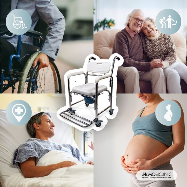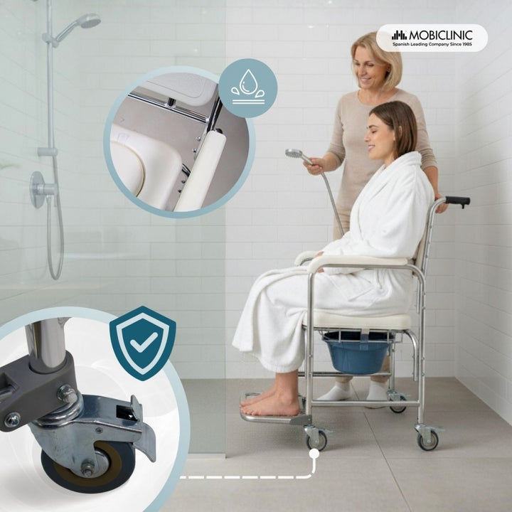 Silla de baño con inodoro | Orinal Extraíble 4.3L | Reposapiés y Reposabrazos | Ruedas con freno | Rope | Mobiclinic