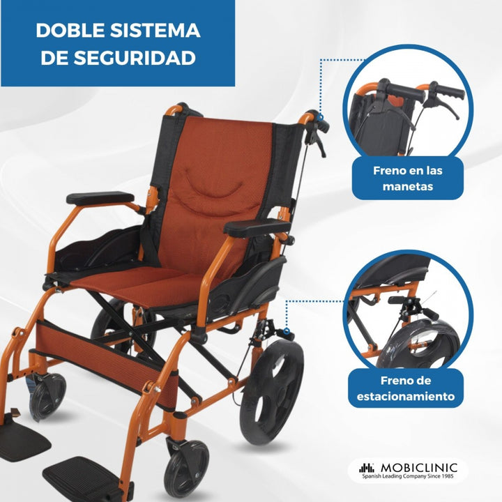 Silla de ruedas | Plegable | Aluminio | Freno en manetas | Reposapiés | Reposabrazos | Naranja | Pirámide | Mobiclinic